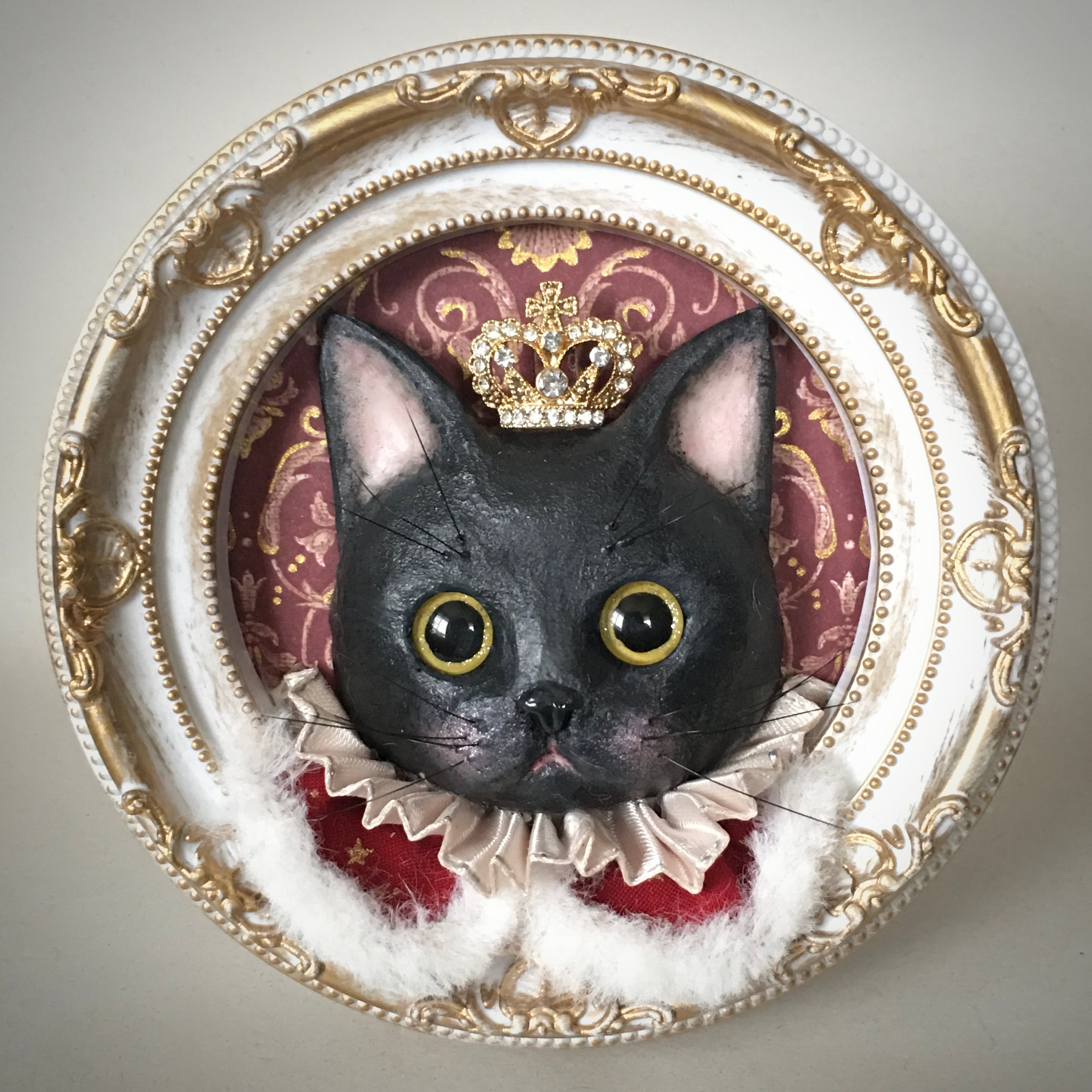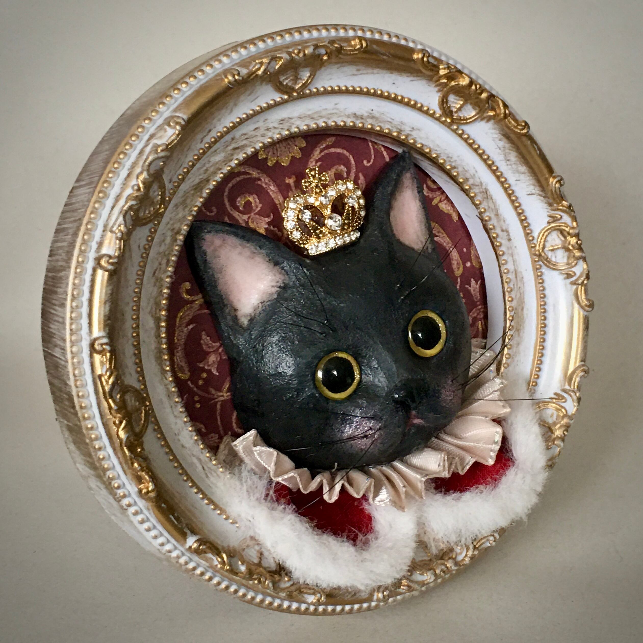 ふっくらとした頬とまんまるな瞳が愛らしい、くろねこの王様の額飾りです。